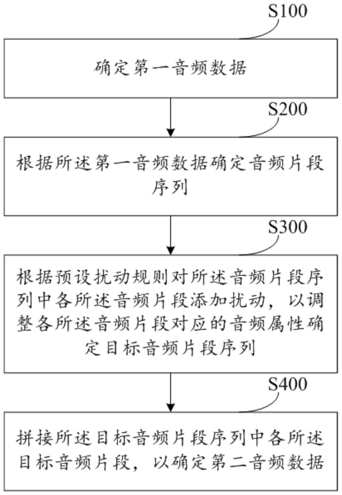 本发明实施例公开了一种音频处理方法、装置、可读存储介质和电子设备,通过确定第一音频数据,对所述第一音频数据进行分割,以确定包括至少一个音频片段的音频片段序列。根据预设扰动规则对所述音频片段序列中各所述音频片段添加扰动,以调整各所述音频片段对应的音频属性确定目标音频片段序列。拼接所述目标音频片段序列中各所述目标音频片段,以确定第二音频数据。本发明实施例通过对音频数据进行分割,获得多个具有对应音频属性的音频片段,对各音频片段添加扰动以调整音调、音量、语速等音频属性,为调整后音频片段确定的音频数据增加情感色彩,提升了合成语音的真实感。