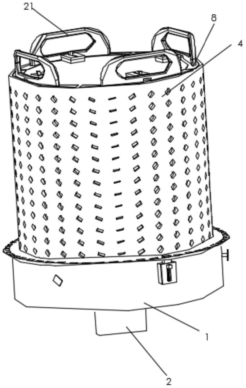 本实用新型提供了一种制氧设备圆筒式风口装置,包括:底板、接管,接管垂直于底板下表面设置,接管设有穿过底板的进风口;内过滤板,内过滤板整体成中空柱状垂直于底板上表面,内过滤板与进风口同轴设置,内过滤板设有多排进气孔,多排进气孔绕轴线排列;外过滤板,外过滤板套设于内过滤板的外侧,且外过滤板设有多个过滤仓,多个过滤仓绕外过滤板轴线排列,过滤仓还设有与外界连通的第二过滤孔,过滤棉设于过滤仓内;锁止组件与过滤棉配合带动过滤棉与过滤仓固定连接;旋转定位组件,旋转定位组件与外过滤板配合控制所述外过滤板旋转角度。通过内过滤板与外过滤板转动配合,便于控制外过滤板的旋转角度,从而控制进气孔的工作状态。