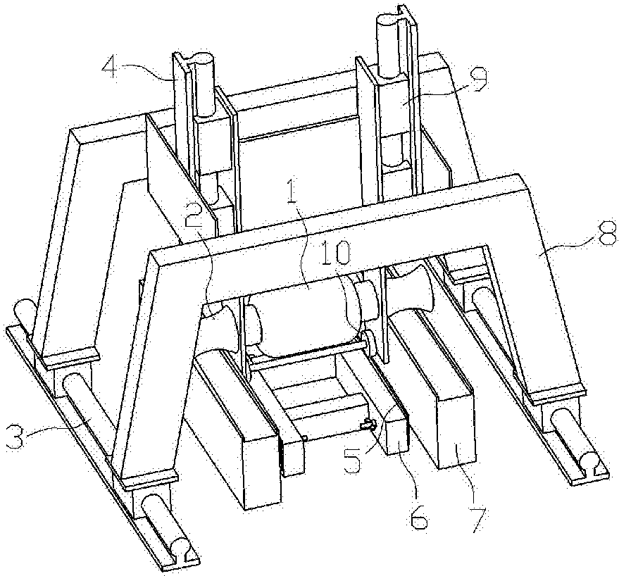 仿型指板精磨机涉及乐器生产加工器械,包括电机(1)、磨头(2)、水平导轨(3)、竖向导轨(4)、模板(5)、模板夹具(6)、指板夹具(7)和悬挂架(8),水平导轨(3)设置在电机(1)的两侧并与电机(1)的转轴垂直,悬挂架(8)通过直线轴承(9)与水平导轨(3)配合连接,竖向导轨(4)竖向固定在悬挂架(8)上,电机(1)通过直线轴承(9)与竖向导轨(4)配合连接,电机(1)的下方设有与电机(1)随动的导轮(10),模板(5)的仿型边在上,通过模板夹具(6)固定在电机的下方,模板(5)的仿型边与导轮(10)抵接。它具有结构简单、造价低、操作简单、使用方便、生产效率高及加工精度高的优点。
