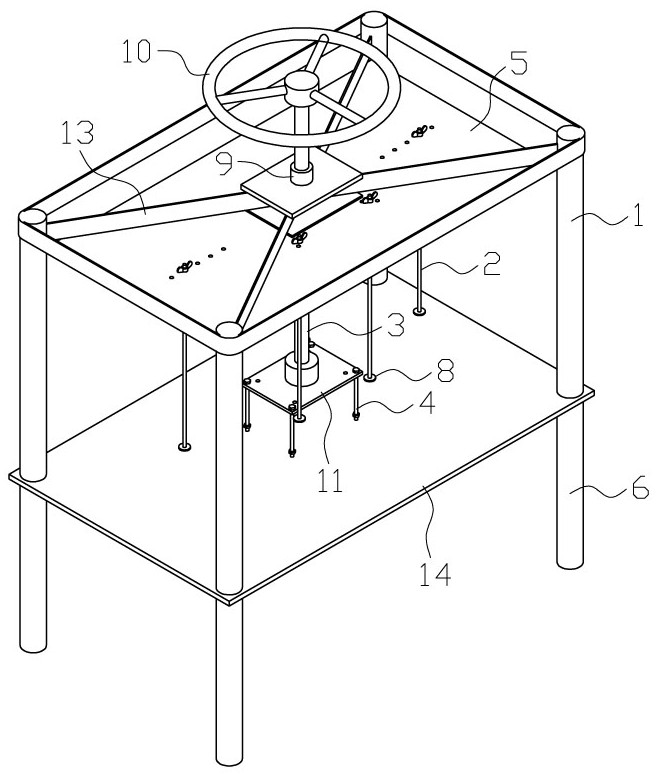 提琴脱模装置涉及脱模工具,机架(1)包括水平设置在顶部的顶架(5)和用于支撑顶架的支脚6,顶架(5)上开有若干位置与提琴侧板框7的端角木块相对应的透孔,支撑杆(2)上端设有螺纹,下端设有用于抵在提琴侧板框7端角木块上的支撑部8,支撑杆(2)竖向设置并通过螺母固定在顶架(1)上的透孔中,顶架(1)的中心位置设有丝母9,脱模丝杠(3)通过与丝母9配合竖向设置在顶架(5)的中心处,脱模丝杠(3)上端设有手旋部(10),下端水平设有一块可相对脱模丝杠(3)自由转动的连接板(11),拉杆(4)设置在连接板(11)上。具有结构设计合理、使用方便、脱模速度快、质量好的优点。