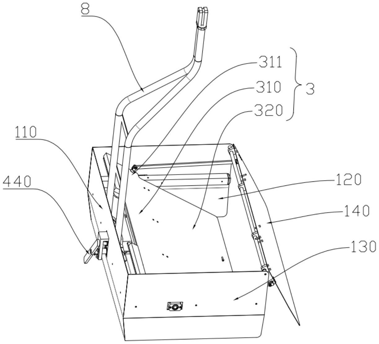 本实用新型公开了一种送料装置,包括安装件,其两端相对设置有第一支撑臂和第二支撑臂;第一承载件,其位于两个支撑臂之间;且第一承载件的两端均设有凸缘,两个凸缘分别搭接于第一支撑臂和第二支撑臂上;第二承载件与第一承载件的下边缘端固定连接;且第一承载件与第二承载件的相接处形成连接端;连接端的一端与第一支撑臂转动连接,另一端与第二支撑臂转动连接;调节组件,调节组件的一端转动设置于安装件上;其另一端延伸至第一承载件的下方,且通过转动调节组件,能够使得调节件组件的此端部抵于第一承载件的下端面处,使得第一承载件、第二承载件同时转动且向下倾斜,物料被卸下。解决了现有技术中送料托盘仍需要人工卸料的技术问题。
