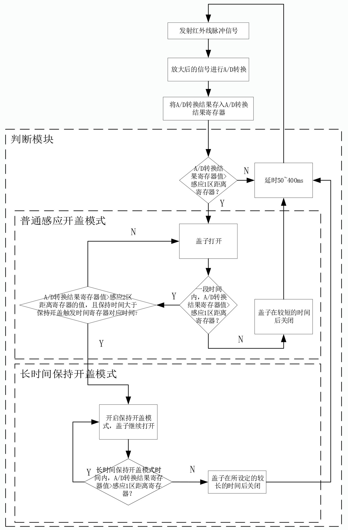 一种感应式垃圾桶的开盖控制方法,微电脑程序控制单元控制红外线发射器对外发射红外加密脉冲信号光,当有感应物放置于感应窗上方的感应区时,红外线接收器接收红外线发射器发射的加密脉冲信号光,红外线接收器接收到的加密脉冲信号光依次经放大器放大、A/D转换器转换,并存储于A/D转换寄存器;然后由判断模块将存储于A/D转换寄存器中的值分别与感应1区距离寄存器的值、感应2区距离寄存器的值进行比较,同时将感应物停留在感应区的时间与保持开盖触发时间寄存器的值进行比较,确定用户触发的普通开盖模式或长期开盖模式;用户可以根据具体的需求进行感应触发,灵活性较强,有效避免了用手直接接触垃圾桶,设计更加人性化。