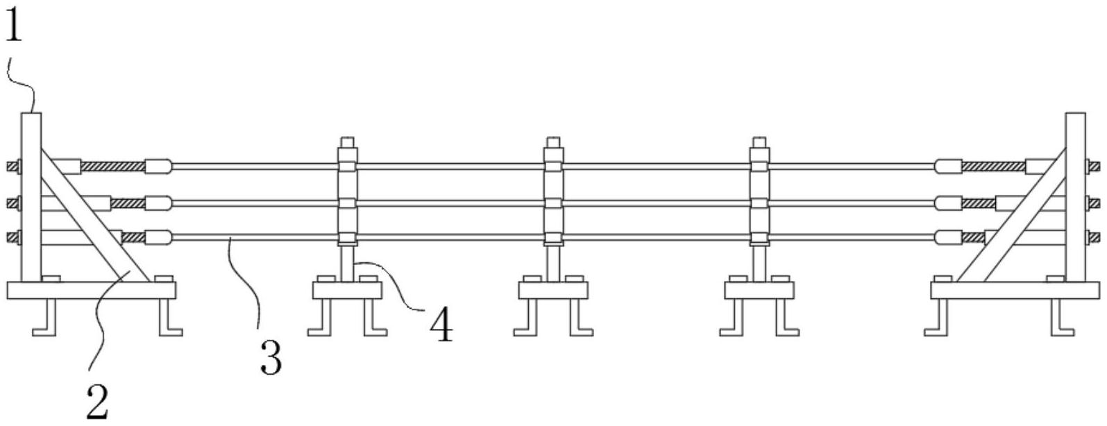 本实用新型公开了一种钢索隔离栏,包括隔离栏本体、端柱、钢索和中间立柱,所述隔离栏本体由两个端柱、钢索和等间距设置在两个端柱之间的若干个中间立柱组成,所述端柱由立杆和焊接在立杆的斜杆组成,所述立杆和斜杆的底端焊接有第一地埋座。本实用新型中,该钢索隔离栏,采用两个端柱、分别在两个端柱之间的若干个立柱和连接在两个端柱之间贯穿立柱上设置的第二套管的钢索组成,整体的结构简单,安装方便,并且这种钢索式隔离栏的设置,对比于传统的金属框架式隔离栏,一方面整体的体积小,携带运输方便,其次钢索的设置,具备一定的弹性缓冲能力,中间立柱上也设置有截面为弧形结构的防撞架,使其也具备一定防碰撞保护作用。