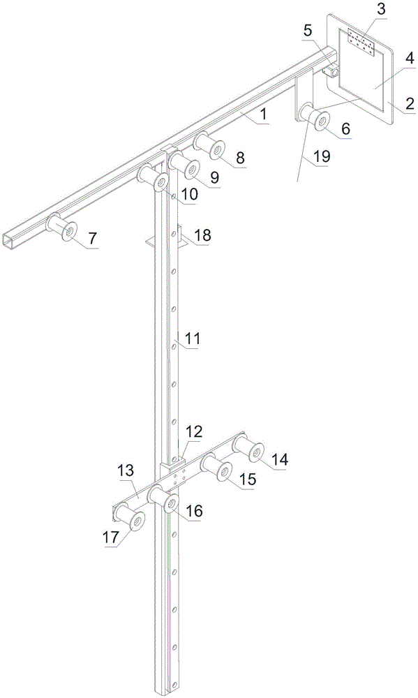 本实用新型公开了一种绕带机缓冲装置,属于绕带机技术领域。它包括横梁、进料门框、合页、门挡、第一接近开关、进料导向滑轮、出料导向滑轮、第一定滑轮、第二定滑轮、第三定滑轮、竖直滑轨、滑块、动滑轮固定支架、第一动滑轮、第二动滑轮、第三动滑轮、第四动滑轮、第二接近开关。当布带出现打结时,打结处在进入进料门框与门挡之间的进料缝隙时,会带动门挡向内摆动,从而触发第一接近开关,发出有打结现象的信号;当布带打结并堵住进料门框与门挡之间的进料缝隙,门挡卡死后无法触发第一接近开关时,布带将动滑轮组和滑块抬升到第二接近开关处,触发第二接近开关动作,发出卡死信号,方便工作人员快速停机,排除打结堵塞故障。