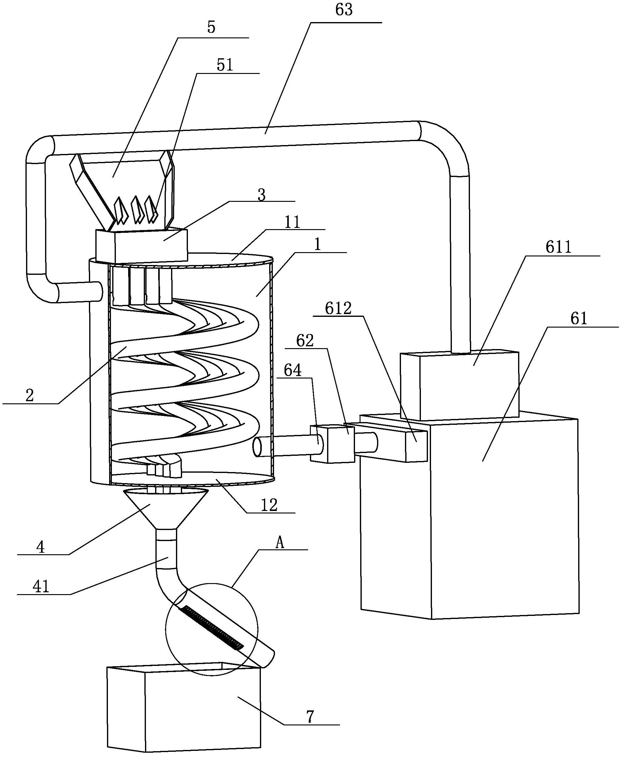 本实用新型给出了一种复合肥颗粒冷却装置,包括冷却桶、冷气循环装置,在冷却桶内设置有四个螺旋冷却管,在冷却桶的上顶板上设置一上料槽,四个螺旋冷却管的上部均位于上料槽内,在冷却桶的下方设置一下料槽,四个螺旋冷却管的下部流出的物料均可流入到下料槽内,在下料槽的下部设置一出料管,在上料槽的上方设置一导料溜槽;冷气循环装置包括空气制冷机、鼓风机,鼓风机可将空气制冷机制造的冷空气送入到冷却桶内。利用该装置进行肥料颗粒冷却时,通过螺旋冷却管的隔离作用,实现了颗粒与冷空气的隔离,从而可防止颗粒内粉末和细小颗粒被流动的冷空气带到环境中,继而利于提高冷却环境质量。
