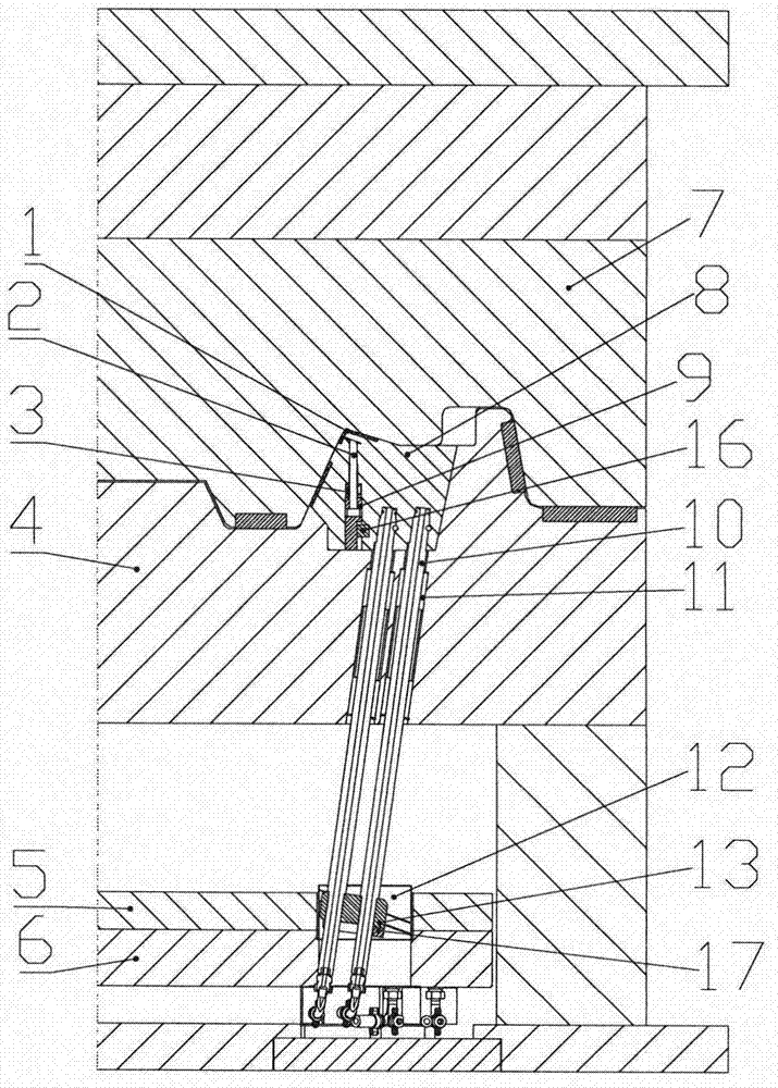 一种单一斜顶内实现两个方向脱模的结构,包括:成型部分、弹簧抽芯部分、顶出部分和斜顶抽芯部分;油缸固定块(15)用螺钉及键固定在凸模(4)上,顶出油缸(14)与油缸固定块(15)用螺钉固定;滑动座(12)与下推板(6)用螺钉固定,下推板(6)与上推板(5)用螺钉固定;弹顶滑块(2)与弹顶滑块连接块(9)用T型槽连接;斜顶(8)割有方孔,弹顶滑块限位(16)直接插入方孔,靠方孔四面定位固定;弹顶滑块连接块(9)端面设计弹簧(3),凸模(4)压紧弹顶滑块连接块(9),并压缩弹簧(3);斜顶导向杆(10)与斜顶(8)用销钉固定后,再通过斜顶杆卡块(17)与滑动块(13)用螺钉固定。这种结构简单、动作可靠,缩短了模具的加工时间和装拆时间。