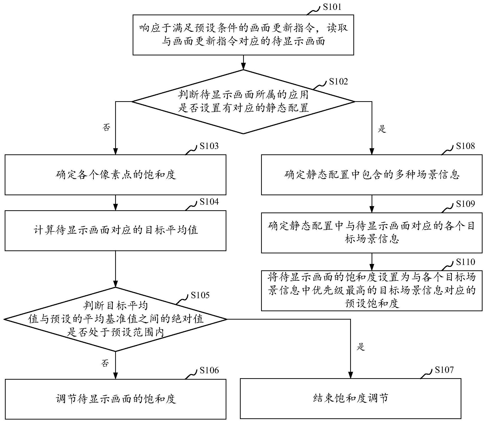 本申请提供的饱和度调节方法、装置、存储介质及彩色墨水屏设备,所述方法包括:响应于满足预设条件的画面更新指令,读取与画面更新指令对应的待显示画面,判断待显示画面所属的应用是否设置有对应的静态配置,若未设置有对应的静态配置,则确定各个像素点的饱和度,计算待显示画面对应的目标平均值,判断目标平均值与预设的平均基准值之间的绝对值是否处于预设范围内,若不处于,则调节待显示画面的饱和度。本方案根据待显示画面,计算待显示画面的饱和度并判断是否符合预期,若不符合则调整待显示画面的饱和度,实现动态调节各个待显示画面的饱和度,同时还能够拓宽饱和度调节的应用场景。