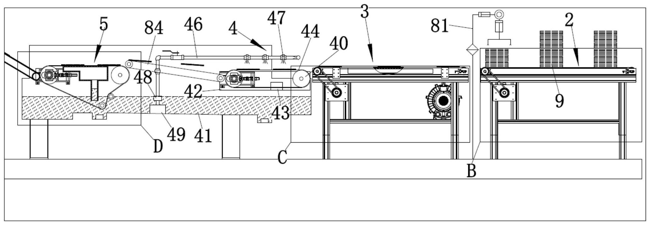 本发明涉及医疗设备技术领域,公开了一种水洗腹部垫生产线,包括安装基板,安装基板上从右到左依次设有进料机构、吸风输送机构、震荡喷淋机构、吸水机构、烘干箱和出料机构;进料机构包括进料传送带,进料传送带上设有多叠腹部垫,吸风输送机构包括可以吸附腹部垫的吸风传送带,震荡喷淋机构包括设置在不锈钢水槽内的震荡支架,震荡支架上端设有震荡传送带,震荡传送带的上方设有多个喷嘴;吸水机构包括吸水传送带。它可以将层叠的半成品自动分成一片片进行传送,可以自动喷淋、自动吸附除湿抽干、自动烘干和自动出料;既能最大限度地减少手工接触产品,也可以循环使用水资源,增加生产效率,降低生产成本。