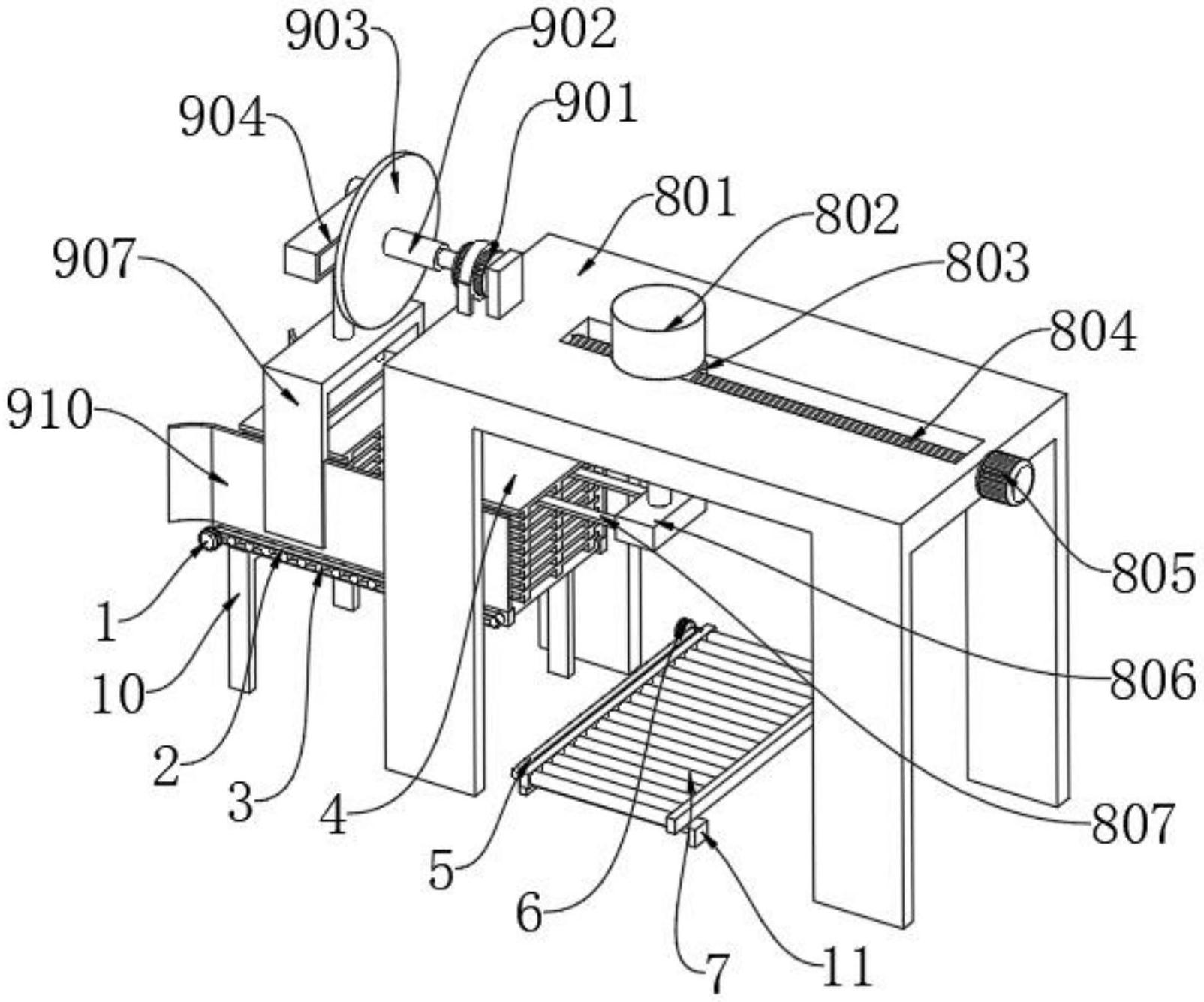 本实用新型公开了设有全自动托盘切换输送机构的全自动堆垛机,包括第一支撑架,第一支撑架的上表面转动安装有多个第一滚轮,多个第一滚轮的外表面传动安装有第一皮带,第一支撑杆的外表面固定安装有第一驱动装置,第一驱动装置的输出端有第一滚轮固定连接,第一滚轮的上表面设置有托盘主体,第一滚轮的上表面设置有安装架,本实用新型设有全自动托盘切换输送机构的全自动堆垛机,通过将插板插设在托盘主体的下表面,从而将堆叠的托盘主体最上表面的一个进行逐个运输,解决了托盘切换的自动输送,保证该机在纸垛输送运行后暂存于托盘主体上,方便平稳传输至下一道工序,保证最高限度地节省时间,提高了工作质量。