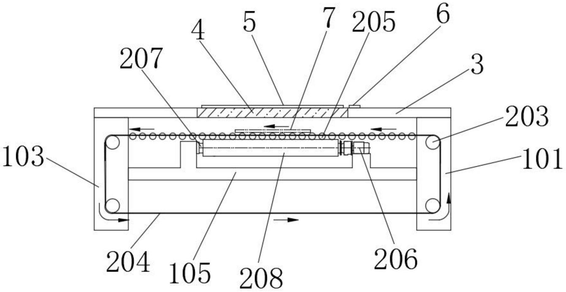 本实用新型涉及输送机构技术领域,且公开了球形滚排横移输送机构,包括支撑机构、纸板本体,所述支撑机构上设置有调节机构,所述支撑机构包括支撑腿一、支撑腿二、支撑腿三、支撑腿四、支撑横板;所述调节机构包括电机一、支撑板、固定轴、输送带、滚珠、电机二、传动轴、横移驱动带,所述固定轴一端固定安装在电机一输出端,所述支撑腿一顶端固定安装有顶板,所述顶板上设置有观察窗,通过各机构的共同作用下可以对纸板的输送方位进行调节,解决了横移输送方向居中、靠左、靠右的可控性,保证生产时最高限度地节省时间,提高了工作质量与生产效率,且该机构对纸板的方位调节更加灵活,方便人员使用,实用性强。