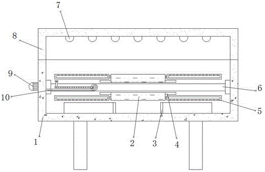 本实用新型公开了一种毛巾折叠装置,包括底座,所述底座的两侧内壁通过轴承连接有均匀分布的输送辊筒,且输送辊筒的圆周处套接有同一个传送带,所述底座的一侧外壁设有输送电机,所述传送带的两侧均铰接有均匀分布的活动侧板,且活动侧板的一侧外壁开设有均匀分布的穿孔,所述底座的两侧内壁设有连接杆,且两个连接杆的一端均设有壳体,两个所述壳体的一端外壁均设有驱动电机,且两个驱动电机的一端均设有转轴。本实用新型使得毛巾翻转过程中保证摊平状态,活动侧板带动毛巾翻转至与传送带靠近时,抽风机停止对该活动侧板的内部抽负压,保证毛巾折叠的平整,可带动转动板复位至水平,弹簧拉动随着传送带而移动的活动座和电磁铁复位。
