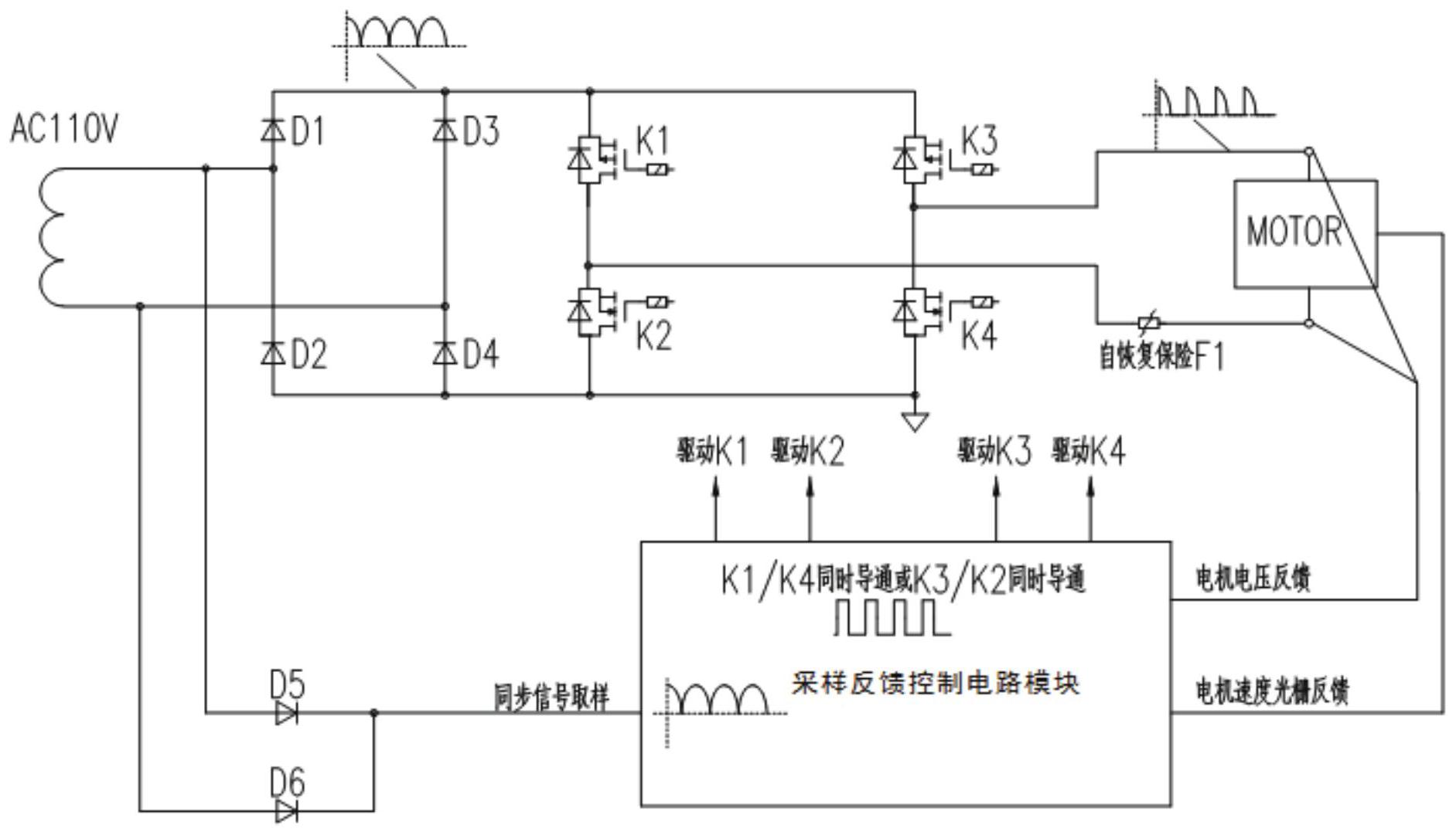 本发明涉及一种带正反转的电机调速控制电路结构,包括输入电路模块、整流电路模块、驱动模块和采样反馈控制电路模块,其中利用这些模块对电机进行控制实现对电机转速和方向的控制,利用全控型开关代替传统的继电器开关,并在采样环节中加入了电机速度光栅反馈信号的采集。采用该种结构的带正反转的电机调速控制电路结构可以提高电路结构的稳定性及速度控制进度、延长电路的寿命并提高电机极性转换速度。