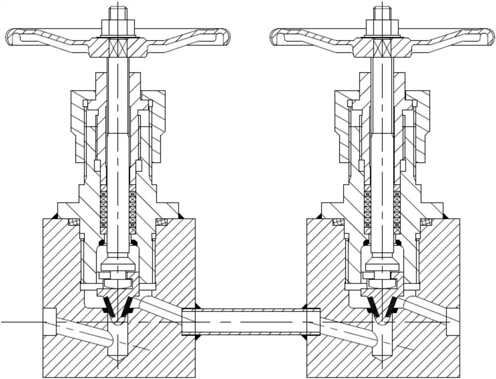 本新型属于工业阀门领域,具体涉及一种高温高压仪表根部双联阀。一种高温高压仪表根部双联阀,其中,包含一个阀体以及两个阀组,所述阀体在相邻两个表面存在两个中腔,在每个中腔上连接有一个阀组,所述阀体在内部有通道连接两个中腔以确保阀门开启时介质能通过该阀门。本新型的显著效果是:保证阀门开关双保险的同时,避免了焊点存在,减小泄漏风险,同时简化生产工艺。将两个阀组放置在阀体的两个侧面,可以错开阀门操纵装置的空间,有效减小阀体尺寸,降低耗材成本。