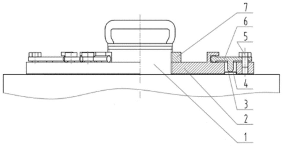 本新型属于理化检测领域,具体涉及一种用于提高晶间腐蚀试件研磨效率的辅助工装。一种用于提高晶间腐蚀试件研磨效率的辅助工装,其中,包括调节杆、定位盘、锁紧螺母、小压板、螺栓、垫片。本新型的显著效果是:一次压装多件试件,使手远离磨盘,提高晶间腐蚀试件磨样的安全性和效率。