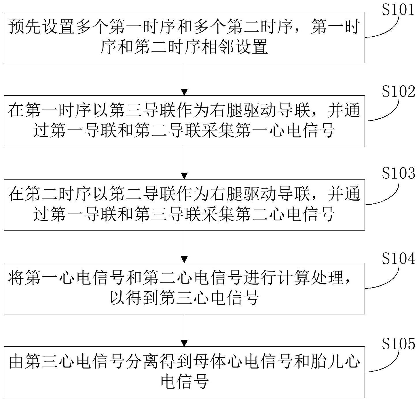 本申请公开了一种心电信号检测方法、系统、设备以及计算机存储介质,该心电信号检测方法应用于心电信号检测系统,心电信号检测系统至少包括第一导联、第二导联和第三导联,心电信号检测方法包括:预先设置多个第一时序和多个第二时序,第一时序和第二时序相邻设置;在第一时序以第三导联作为右腿驱动导联,并通过第一导联和第二导联采集第一心电信号;在第二时序以第二导联作为右腿驱动导联,并通过第一导联和第三导联采集第二心电信号;将第一心电信号和第二心电信号进行计算处理,以得到第三心电信号;由第三心电信号分离得到母体心电信号和胎儿心电信号。本申请的心电信号检测方法通过复用右腿驱动导联,简化了导联数量以及导联系统。