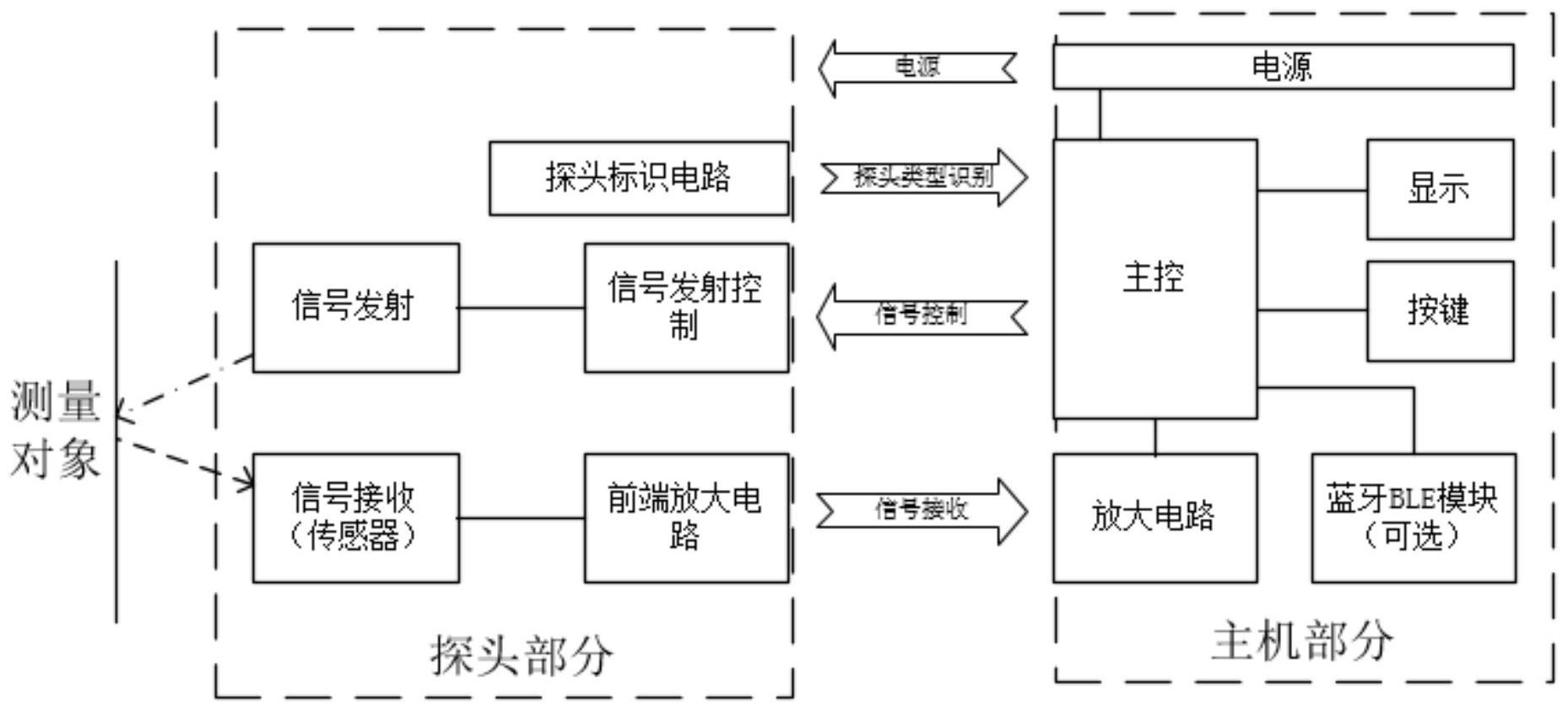 本实用新型提供了一种可替换探头的便携式医疗检测仪,其包括检测主机和探头,所述探头与检测主机可拆卸的连接;所述探头设有探头连接数据接口,所述检测主机设有与探头连接数据接口匹配的主机连接数据接口;所述检测主机包括显示屏、按键、电源模块和主控模块,所述显示屏、按键、电源模块分别与主控模块连接;所述探头包括信号发射模块、信号接收模块、探头识别电路;所述信号发射模块、信号接收模块、探头识别电路分别通过探头连接数据接口、主机连接数据接口的对接实现与检测主机的主控模块、电源模块的电连接。采用本实用新型的技术方案,探头和主机可拆卸的连接,主机可连接不同的探头,实现一机多用,节省了资源。