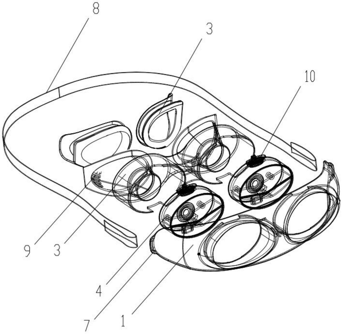 本实用新型公开了一种眼罩式微网雾化器,涉及医疗器械技术领域。所述雾化器包括从右到左设置的眼罩主体和眼罩支架,所述眼罩主体和眼罩支架的前后两侧各形成有一个微网雾化模块安装孔,两个微网雾化模块位于所述眼罩主体与所述眼罩支架之间,微网雾化模块的右端固定到所述眼罩主体的安装孔内,微网雾化模块的左端固定到所述眼罩支架的安装孔内,所述眼罩支架的左侧的安控孔内固定连接有眼贴,所述微网雾化模块包括药仓,所述药仓的上下两端具有开口,所述药仓的下端开口通过雾化产生模块进行封闭,与所述雾化产生模块相对应的眼罩支架上形成有出雾口。所述雾化器具有可提高给药的舒适度,噪音小,使用方便等优点。
