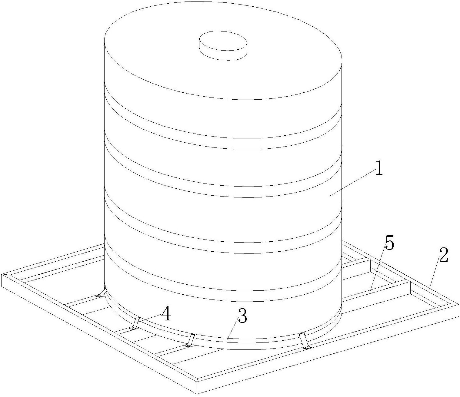 本实用新型公开了一种水箱固定底座,包括水箱、底座、金属圈和连接片;所述底座为一矩形的金属框;所述金属框的框架之间均匀设置有若干加强条;所述水箱固定在所述加强条上;所述金属圈固定在所述水箱的底部外侧;所述连接片的顶端固定在所述金属圈上;所述连接片的底端固定在所述加强条上。本实用新型结构稳固,具有以下优点:水箱倾斜或者移动水箱也不会轻易散架,保证了财产及人身安全;便于运输、装卸;保证水箱安装在不平整地面和楼面上的稳固,减轻地面、楼面的承重;保证水箱底部受力平整,并且保持水箱底部的干燥,避免水箱底部积水,延长水箱的使用寿命。