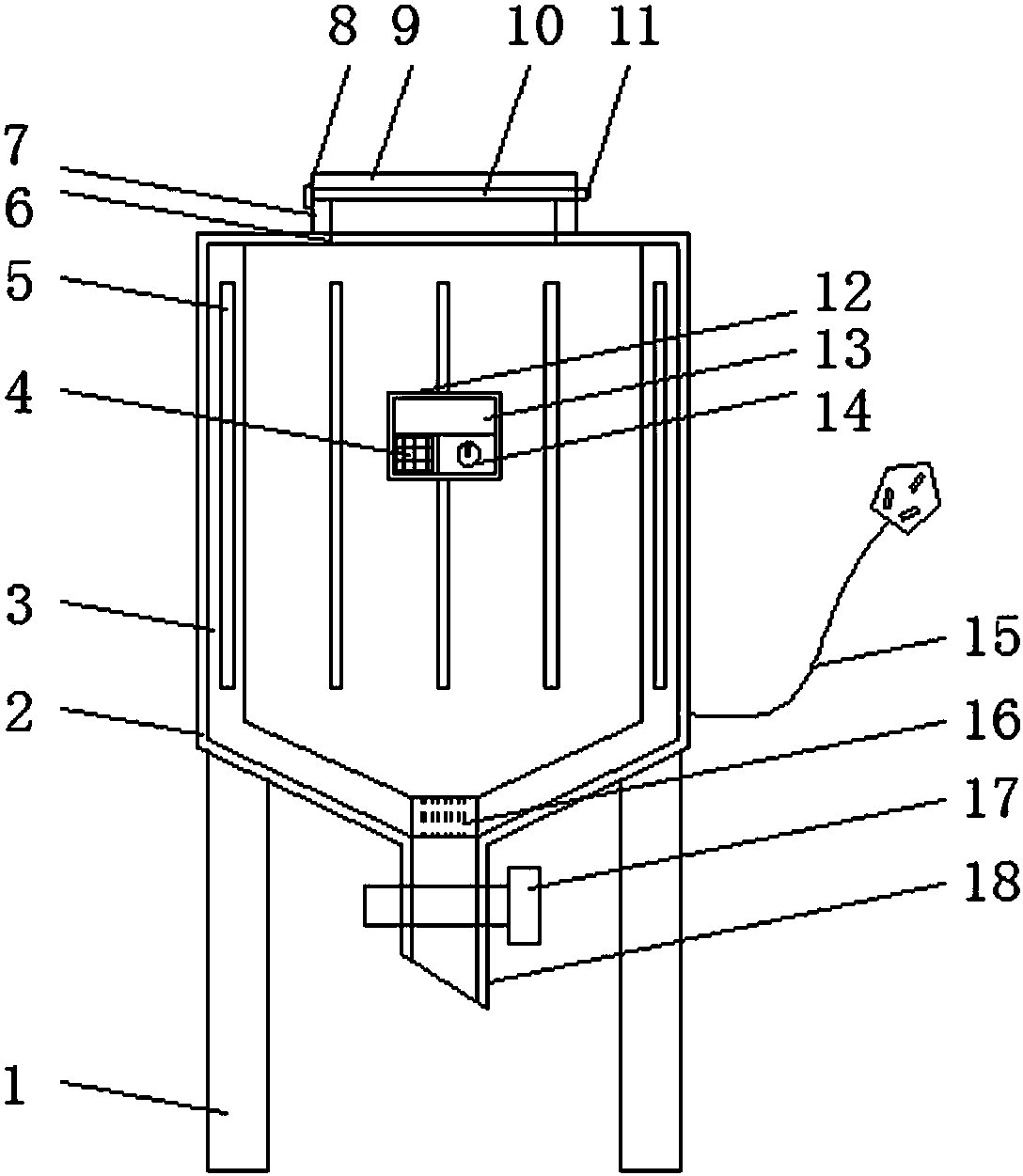 本实用新型公开了一种高分子材料热熔装置,包括保护套、热熔箱和活动盖,所述热熔箱的内侧安装有加热片,所述热熔箱的下端阵列开设有通孔,所述保护套套接在热熔箱的外侧,所述保护套的下端连通安装有出料管,所述出料管的中间处活动安装有活动阀,所述出料管位于活动阀的正下端,所述保护套的上端中间处开设有进料口,所述进料口的上端安装有进料管,所述活动盖的一侧通过铰链活动安装在进料管的上端,所述活动盖异于铰链的一侧安装有固定扣,所述活动盖的下端四周固定有密封垫,所述保护套的一侧外端安装有控制板,所述控制板通过导线与外接电源线电连接。本实用新型通过专门的对各种高分子材料进行热熔,提高了高分子材料产品的质量。