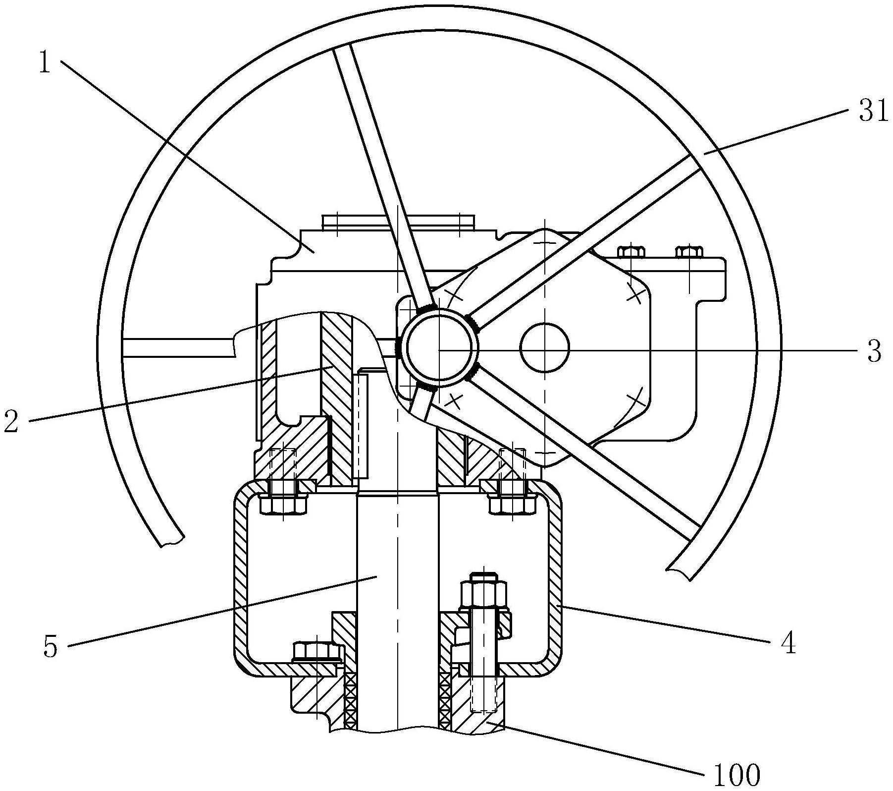 本实用新型涉及涉及球阀的启闭结构,尤其涉及一种球阀球体启闭结构以及球阀,该球阀球体启闭结构包括壳体,其内部转动连接有蜗轮和蜗杆,蜗杆与蜗轮啮合;连接架,一端与壳体固定连接、另一端与壳体固定连接;以及阀杆,转动连接于阀体的内部,阀杆的一端与球体固定连接、另一端与涡轮固定连接;其中,连接架位于壳体与阀体之间,阀杆穿过连接架。本实用新型利用蜗轮蜗杆对阀杆进行传动,然后使蜗轮对阀杆进行驱动,以使球体进行启闭,解决了直接旋拧阀杆对阀杆扭矩较大的问题,降低了启闭球体的过程中阀杆断裂的风险。