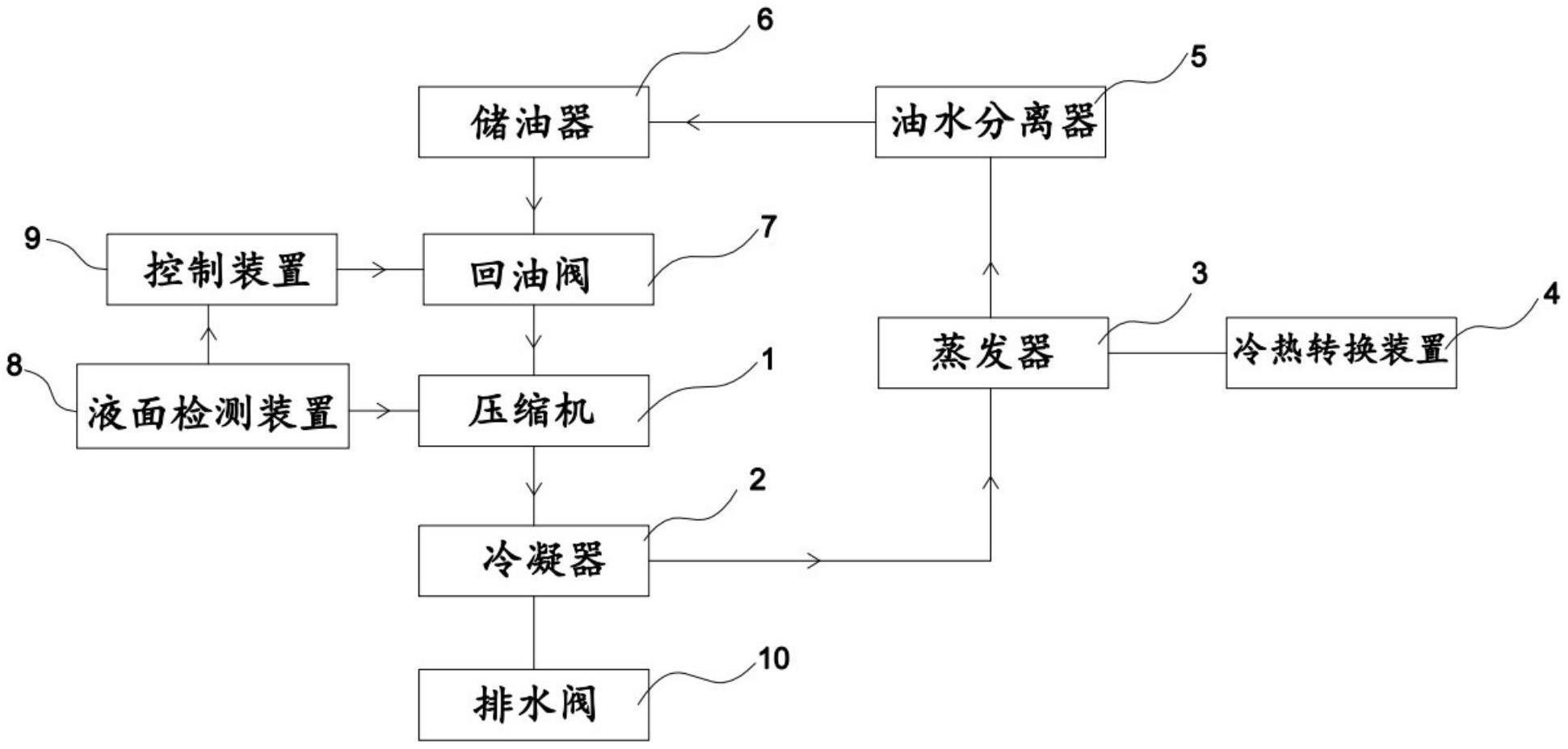 本实用新型涉及一种空调低温制热的回油系统,包括通过管道依次连接的压缩机、冷凝器、蒸发器、油水分离器和储油器,储油器通过回油阀与所述压缩机连接,压缩机内设有液面检测装置,液面检测装置与控制装置通信连接,控制装置与回油阀通信连接。通过液面检测装置对压缩机内的润滑油含量进行检测,并根据检测结果对压缩机进行回油或停止回油,使压缩机内的润滑油含量始终处于设定范围内,保证压缩机正常运行,解决了因压缩机内润滑油含量不足,导致压缩机不能正常运行的问题。当压缩机内润滑油的液面高度低于设定值时,液面检测装置向控制装置发送信号,控制装置控制回油阀打开,向压缩机补充润滑油直至达到设定范围。