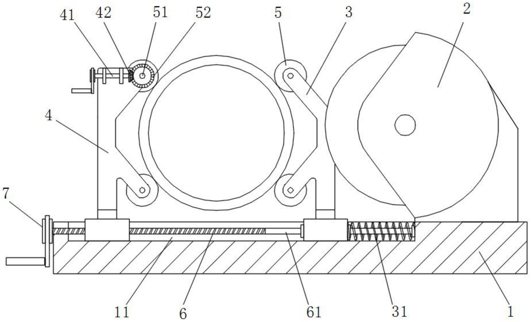 本实用新型公开了一种路灯杆生产用的灯杆切断设备,涉及切断设备技术领域,包括底座,所述底座的顶部固定安装有切割机,所述底座顶部开设有导槽,所述底座的顶部滑动安装有第一V形架和第二V形架,所述第一V形架位于底座靠近切割机的一侧,且所述第一V形架和第二V形架的底端均延伸至导槽中,并与导槽滑动配合,所述导槽的内部转动安装有螺纹杆。本实用新型通过转动螺纹杆带动第二V形架向切割机靠拢,进而使第一V形架和第二V形架相互靠近,将灯杆卡在二者之间,通过转动灯杆,即可完成对灯杆的完整切割,从而使灯杆以转动的方式与切割机不断的接触切割,避免了灯杆直径较大,而难以一次压切切割的问题。