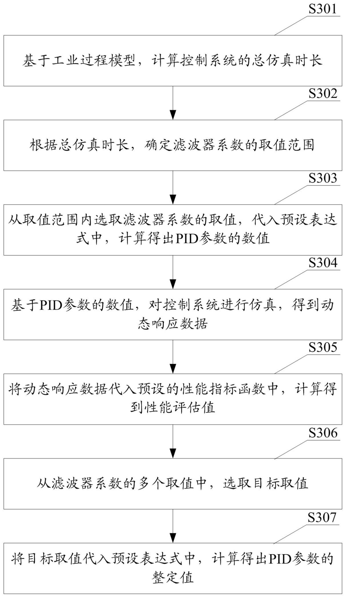 本申请公开了一种PID参数整定方法、装置、存储介质和设备,基于工业过程模型,计算控制系统的总仿真时长。根据总仿真时长,确定滤波器系数的取值范围,滤波器系数为预设表达式所包含的计算参数,预设表达式用于指示PID参数。从取值范围内选取滤波器系数的取值,代入预设表达式中,计算得出PID参数的数值。基于PID参数的数值,对控制系统进行仿真,得到动态响应数据。将动态响应数据代入预设的性能指标函数中,计算得到性能评估值。从滤波器系数的多个取值中,选取目标取值。将目标取值代入预设表达式中,计算得出PID参数的整定值。利用本申请所述方法对PID参数进行整定,能够提高PID控制器的控制性能,以满足控制系统的快速性和稳定性的控制要求。