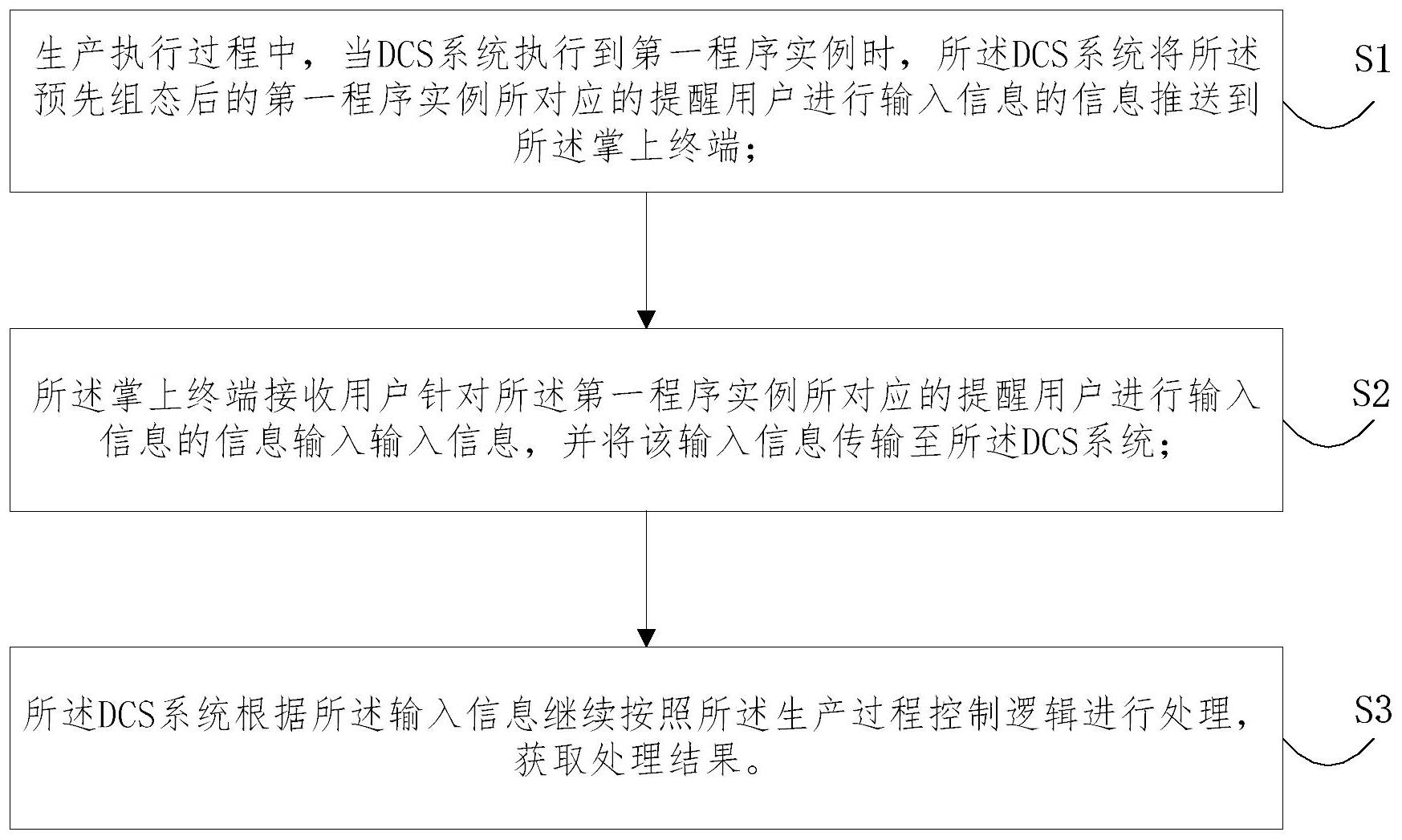 本发明涉及一种基于DCS系统和掌上终端的自动化生产方法及系统,DCS系统与掌上终端通信连接;DCS系统执行预先编辑的生产过程控制逻辑;该生产过程控制逻辑中包括第一程序实例所对应的提醒用户进行输入信息的信息,第一程序实例为该生产过程控制逻辑中需要用户输入输入信息的程序实例;方法包括:当DCS系统执行到第一程序实例时,DCS系统将预先组态后的第一程序实例所对应的提醒用户进行输入信息的信息推送到掌上终端;掌上终端接收用户输入的输入信息,并将该输入信息传输至所述DCS系统;DCS系统根据输入信息继续按照生产过程控制逻辑进行处理,获取处理结果。