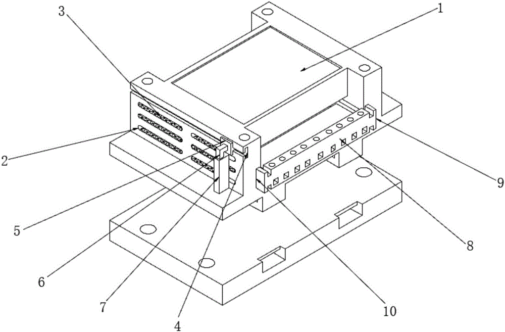 本实用新型公开了一种AHU控制装置,包括控制装置本体、通风槽、过滤网、第一滑槽、第一滑块、连接杆、毛刷、接线板、第二滑块、第二滑槽、固定板、固定孔、卡槽、卡块、弹簧、滚珠和定位孔,所述控制装置本体两侧均开设有通风槽,本实用新型结构科学合理,使用安全方便,通风槽有效的对控制装置本体内部进行通风,对控制装置本体内部进行散热,在外界空气与控制装置本体内部空气进行交换时过滤网有效的对空气中的灰尘杂质进行过滤,防止灰尘进入控制装置本体内部对控制装置本体内部的电器元件造成损坏,通过滑动第一滑块使毛刷进行移动,从而对过滤网表面附着的灰尘进行清理,防止灰尘堵塞过滤网,进而影响通风效果。