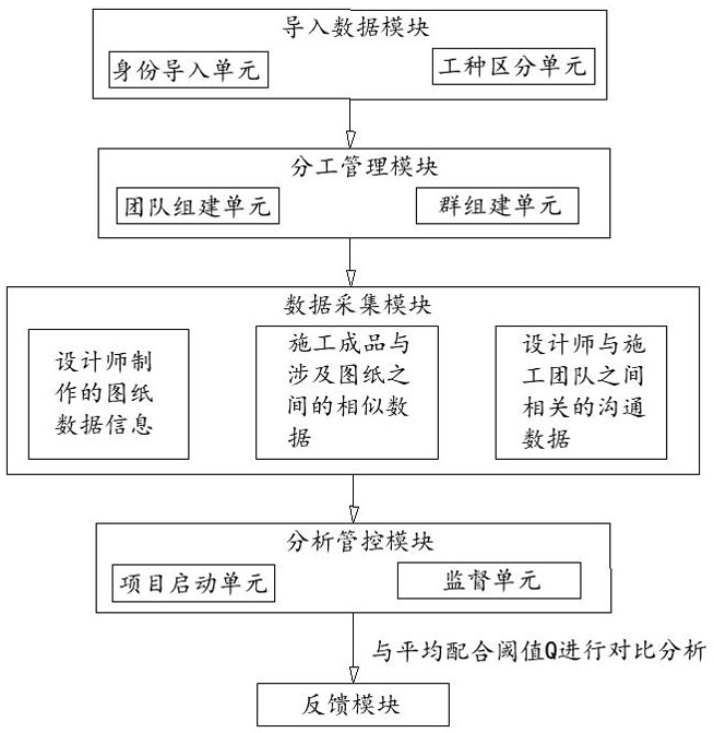 本发明公开了一种针对设计师与产业工人的工作流程管理系统,涉及建筑施工的技术领域,根据记录设计师与施工团队之间的沟通数据,有助于系统及时发现并解决潜在的沟通问题,确保信息传递的准确性,减少误解;分工管理模块将依据管理者的分配确定出项目团队的成员,并建立各图纸的专属施工团队,确保每个任务都有专业的人员负责,降低了项目风险,通过分析管控模块,多维度的进行分析与总结,进一步精确评估设计师与产业工人之间的配合度,并生成配合评估指数Phzs,有助于早期发现问题,提供精准的改进建议;预警通知模块利用历史数据计算平均配合阈值Q,有助于识别配合趋势和变化,提供更有针对性的预警和改进建议。