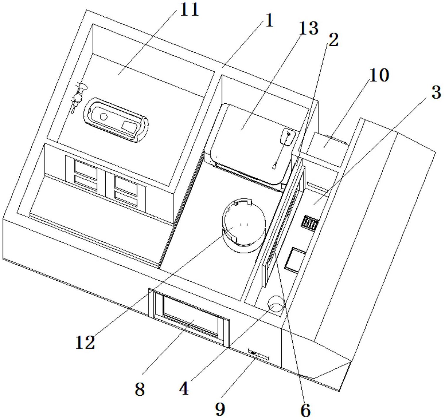 本实用新型涉及核酸采样技术领域,具体为一种移动式核酸采样舱,包括舱体,舱体前侧舱壁上设置有舱窗,舱窗包括内、外并行设置的双层采样窗,双层采样窗底部之间设置有操作台,操作台下方的前侧舱壁为双层结构且与操作台构成密闭空间;操作台上开设有垃圾投放口,密闭空间内与垃圾投放口相对设置有垃圾箱;位于双层采样窗之间的顶部舱壁上设置有雾化消毒设备;内层采样窗上开设有两个圆孔,圆孔中通过密封圈设置有操作手套,外层采样窗上与圆孔相对位置开设有长孔;舱体右侧舱壁上设置有出入门。医护人员在移动式核酸采样舱内可直接利用操作手套进行操作,无需穿戴多层防护服、手套以及佩戴护目镜提高医护人员工作便利性和舒适性。