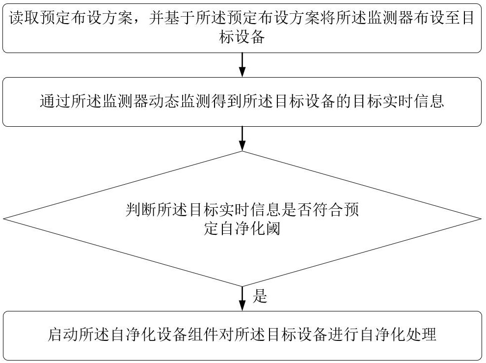 本发明提供了一种自净化控制方法及装置,涉及智能控制技术领域,包括:读取预定布设方案,并基于所述预定布设方案将所述监测器布设至目标设备;通过所述监测器动态监测得到所述目标设备的目标实时信息,并判断所述目标实时信息是否符合预定自净化阈;若是符合,启动所述自净化设备组件对所述目标设备进行自净化处理。本发明解决了传统的净化器在清洁过程中无法充分去除污染物和残留物,并且长期使用后存在残留油脂的情况,导致存在净化器性能下降,并且净化有效性和持久性降低的技术问题。