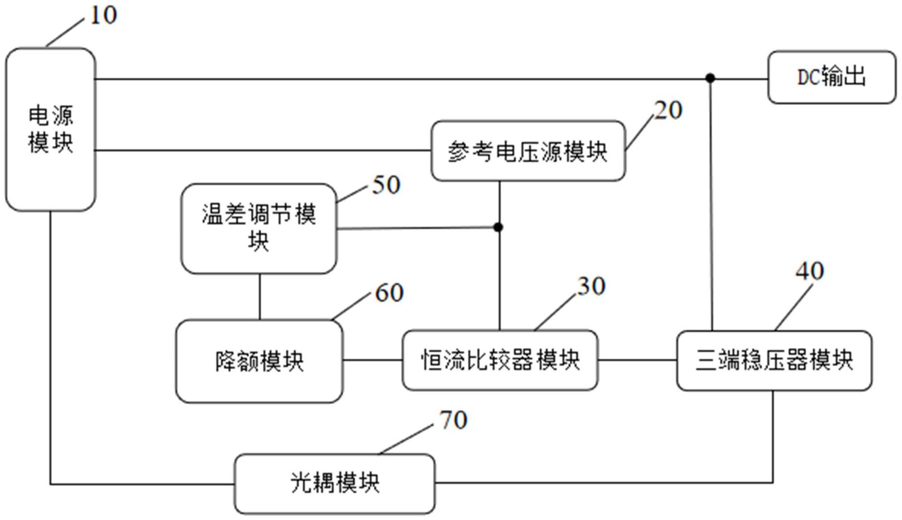 本实用新型实施例公开了一种锂电池的充电电路包括:电源模块、参考电压源模块、恒流比较器模块、温差调节模块、降额模块、三端稳压器模块、光耦模块,通过温差调节模块检查充电器工作温度,再通过降额模块、三端稳压器模块和光耦模块进行反馈,实现了对在不间断电流情况下对电池进行充电,减少电池温度降额后的反复对电池进行切换充电,延长电池的使用寿命。