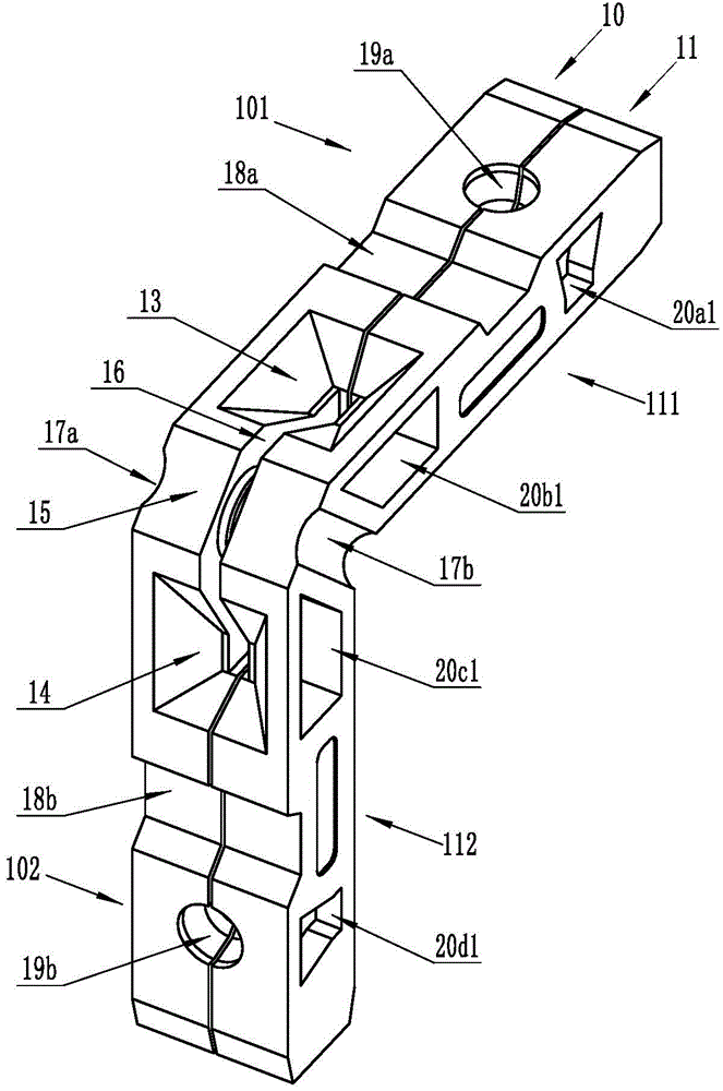 本实用新型属于型材组装用配件技术领域,尤其涉及一种型材组角用复合角码,包括对称设置的第一角码体和第二角码体;在拐角处的内侧面上设有沿第一连接臂、第二连接臂延伸的第一导流槽;两第一连接臂邻接处的外侧面上设有第一注胶槽,两第二连接臂邻接处的外侧面上设有第二注胶槽;在拐角处的外侧面上设有第二导流槽;邻接面上的拐角处设有第三导流槽,分别与第一导流槽、第一注胶槽、第二注胶槽、第二导流槽连通;在第一角码体远离邻接面的侧面拐角处、第二角码体远离邻接面的侧面拐角处上分别设置有连通第一导流槽与第二导流槽的第四导流槽;使用时,可以增强型材组角后连接强度,同时能够增强组角处的平整度,避免在型材组角处发生漏水。