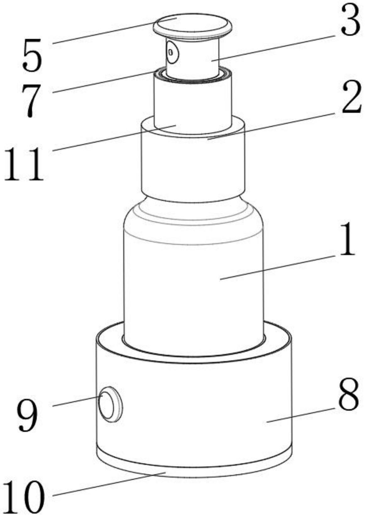 本实用新型提供一种防误按压的瓶装消毒抗菌喷壶,涉及瓶装消毒喷剂技术领域,包括瓶体,所述瓶体顶面设有头冒,所述头冒包括瓶口连接端和按压连接端,所述瓶体内部设有出水管,所述按压连接端顶面设有按压头,且按压头嵌合于按压连接端内部,所述按压头顶面设有压板,所述按压连接端的表面套接有防按压外壳,所述防按压外壳顶面的凹槽内安装有磁铁,所述压板底面设有金属圈,在不需要使用喷剂时可将喷剂瓶的按压端进行限位,有效的防止按压端被误触,提高了使用者的使用体验。