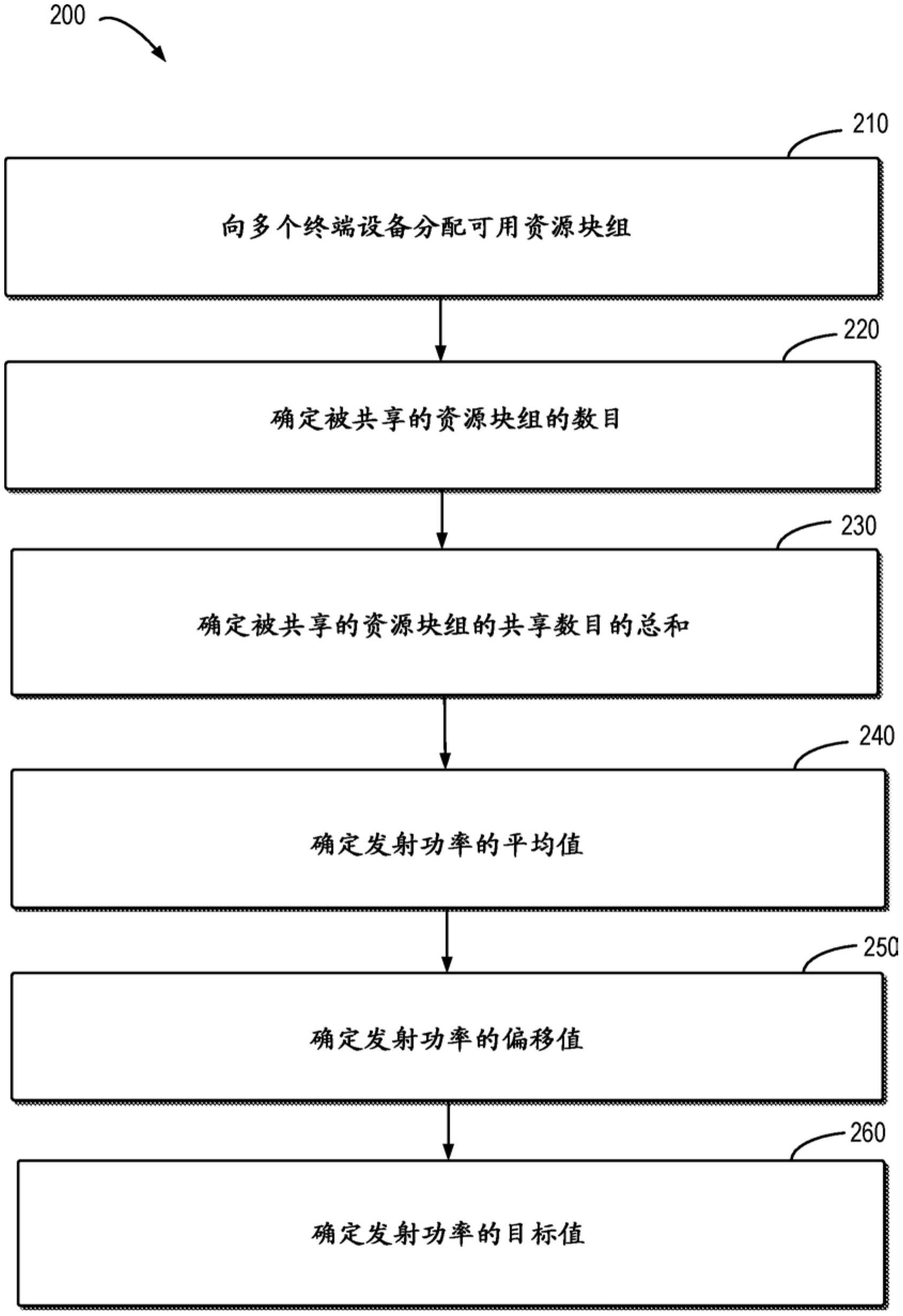 本公开的实施例提供了用于通信的方法、设备和计算机可读介质。在网络设备处实现的方法中,该方法包括:在网络设备处向多个终端设备分配可用资源块组RBG;确定可用RBG中的共享RBG的数目,该共享RBG被多个终端设备共享;确定多个终端设备中的每个终端设备的共享RBG的共享数目总和;基于可用RBG的数目和网络设备的总功率来确定发射功率的平均值,该平均值指示由网络设备分配给多个终端设备的基本功率;基于共享RBG的数目、共享数目总和以及平均值来确定用于多个终端设备中的每个终端设备的发射功率的偏移值;并且基于偏移值和平均值来确定用于多个终端设备中的每个终端设备的发射功率的目标值。