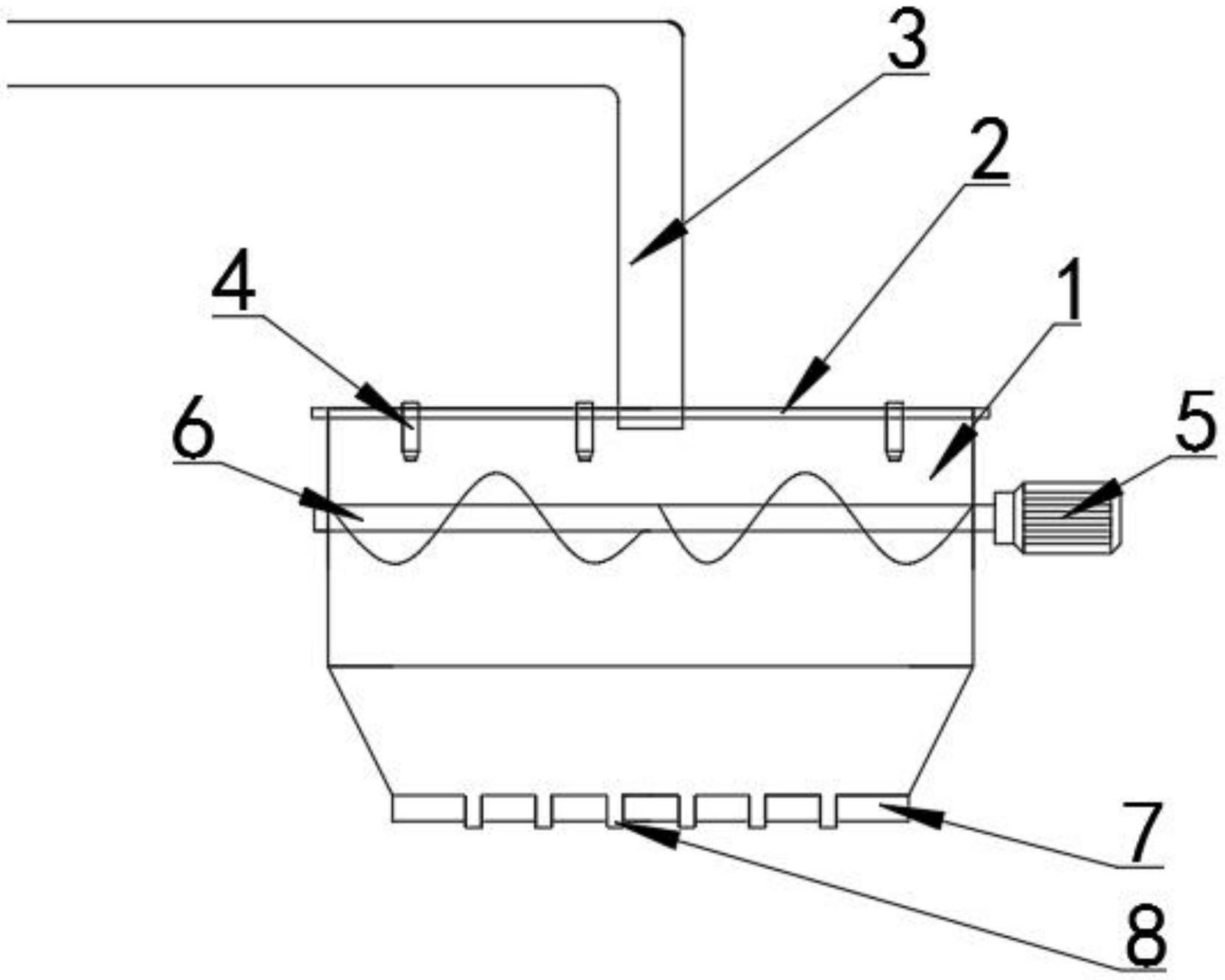 一种颗粒包装机的装袋下料斗下料均衡器,料斗内横向转动设置双向绞龙,料斗的外侧对应双向绞龙的一端设置电机,料斗的下端设置分料器,料斗盖中横向均匀分布三个料位传感器,料斗盖中部垂直设置进料管,进料管的出料端贯穿料斗盖伸入料斗内部,所述的双向绞龙朝向电机一端的端部贯穿所对应侧的料斗壁与电机的动力输出端连接,所述的分料器上横向均匀分布六个下料口;通过电机带动双向绞龙旋转,能够将料斗底部中堆积的原料颗粒向料斗两侧拨动,使料斗内的颗粒原料均匀分布、分料器上的分料口均匀下料,保证产品物料分装量均匀、一致。