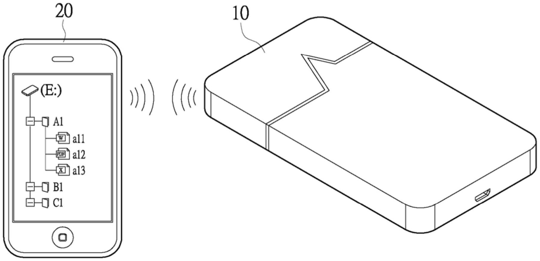 本申请公开一种便携式硬盘装置,与一智能手持装置无线耦接,所述便携式硬盘装置包括有一便携式硬盘储存组件、一内存模块、一储存文件分层结构以及一无线传输模块;储存文件分层结构设置在内存模块之中,且储存文件分层结构耦接于无线传输模块。智能手持装置中设有一无线接收模块与便携式硬盘装置的无线传输模块以无线方式相耦接;当两者相互无线耦接时,智能手持装置显示出便携式硬盘装置中的储存文件分层结构。所述的储存文件分层结构当所述便携式硬盘装置耦接于一计算机时,在所述计算机中的一操作系统内设有一内存模块驱动程序,所述内存模块驱动程序即对应作用于所述储存文件分层结构。
