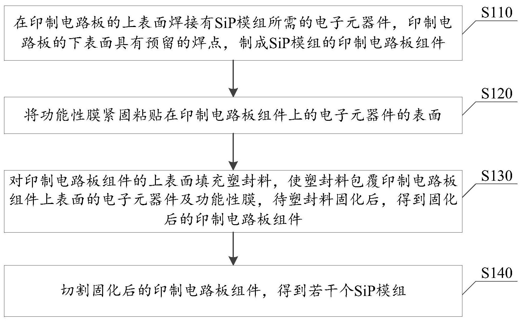 本发明公开了一种SiP模组及其制造方法,该方法包括:在印制电路板的上表面焊接有SiP模组所需的电子元器件,所述印制电路板的下表面具有预留的焊点,制成SiP模组的印制电路板组件;将功能性膜紧固粘贴在所述印制电路板组件上的所述电子元器件的表面;对印制电路板组件的上表面填充塑封料,使所述塑封料包覆所述印制电路板组件上表面的电子元器件及功能性膜,待塑封料固化后,得到固化后的印制电路板组件;切割所述固化后的印制电路板组件,得到若干个所述SiP模组。本发明直接将具有电磁屏蔽功能的功能性膜和电子元器件一起塑封,塑封完成后的SiP模组就具备电磁屏蔽功能,简化了SiP模组的制造流程。