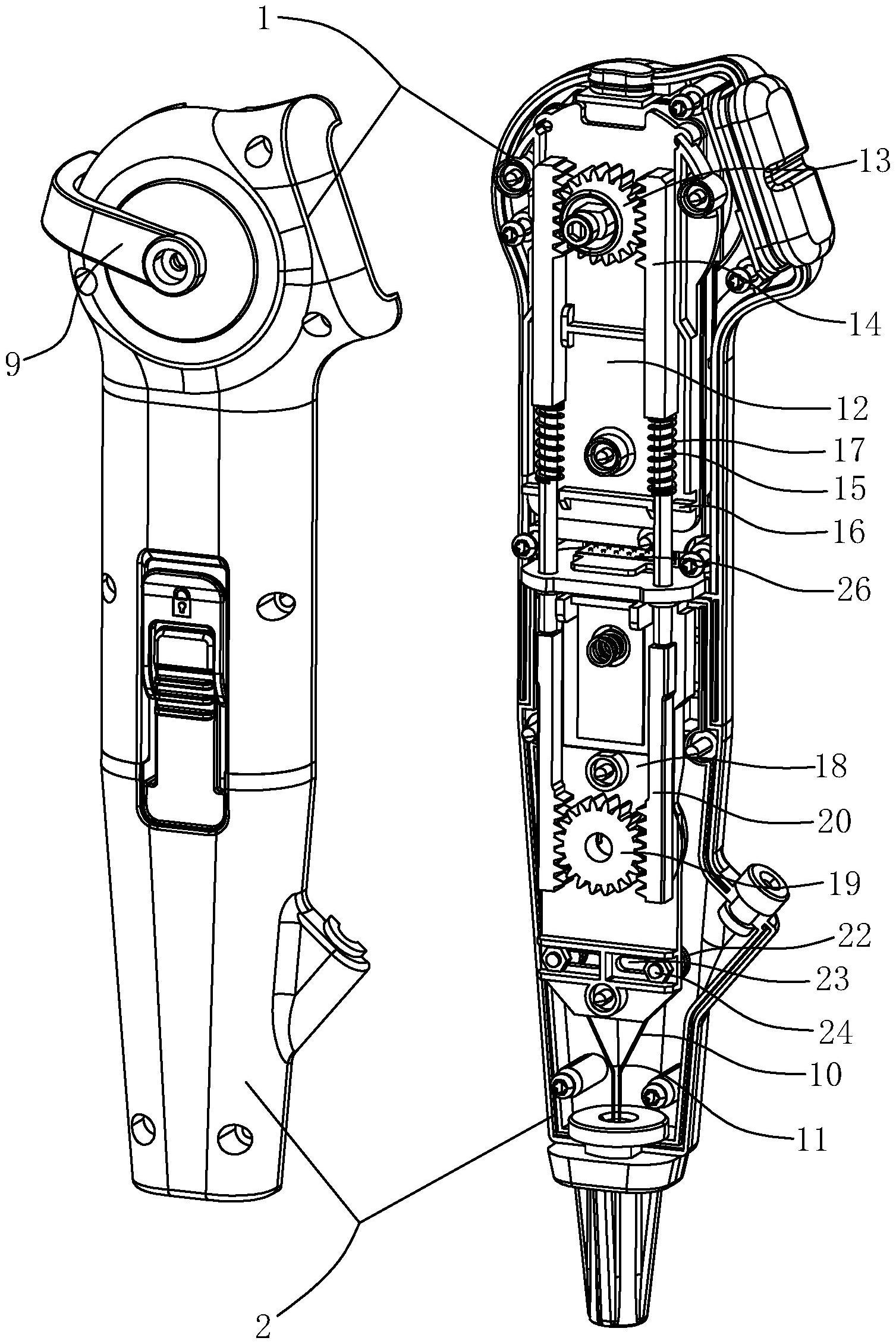 本实用新型公开了一种分体式一次性内窥镜,包括上手柄壳体和下手柄壳体,所述上手柄壳体底部设有插接止口,所述下手柄壳体顶部设有插入部,所述插入部插接并卡固在插接止口内,上手柄壳体内设有PCBA主板、PCB电源板和内置电池,所述内置电池和PCB电源板之间电连接,所述PCB电源板与PCBA主板之间电连接,PCBA主板集成有无线传输模块和/或蓝牙模块,所述下手柄壳体内设有PCB板,当插入部插接并卡固在插接止口内时,所述PCBA主板与PCB板之间电连接及信号连接。本实用新型结构紧凑,组装方便,能够消除外部线缆的负担,使用灵活性与使用便捷性好。