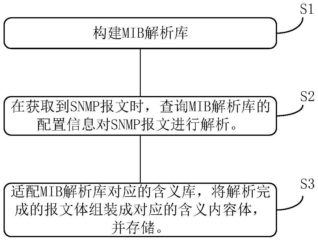 本发明公开了一种SNMP报文解析方法、可读存储介质及计算机设备,SNMP报文解析方法包括步骤:构建MIB解析库;在获取到SNMP报文时,查询MIB解析库的配置信息对SNMP报文进行解析;适配MIB解析库对应的含义库,将解析完成的报文体组装成对应的含义内容体,并存储。本发明预设MIB解析库,通过实时,动态配置不同设备的MIB解析库及对应的含义库来进行不同设备的报文解析,避免了不同种类,不同厂家,不同型号的设备分别采用不同的报文解析方法,能实现报文解析的通用化。