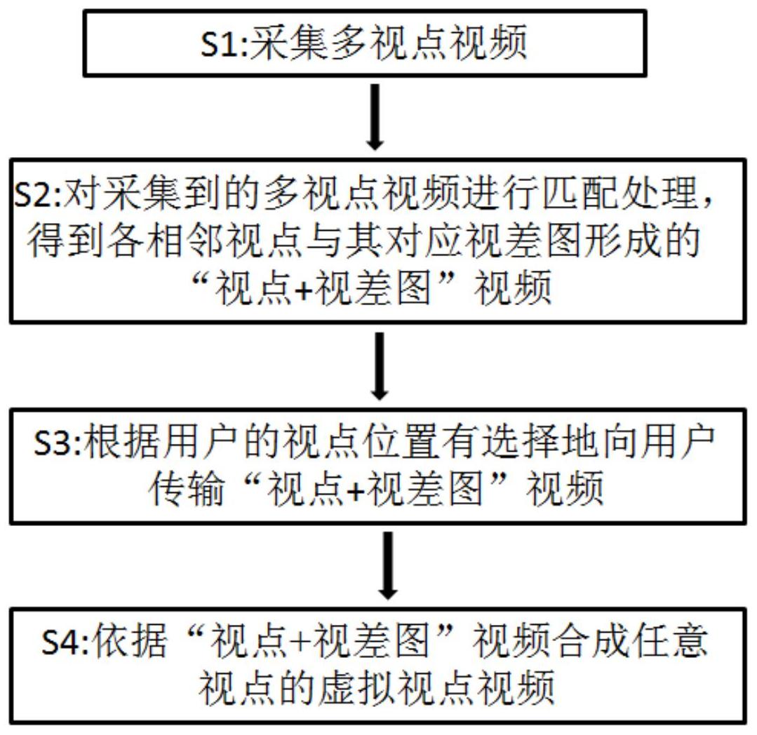 本发明提出一种自由视点视频导播方法,包括以下步骤:S1:采集多视点视频;S2:对采集到的所述多视点视频进行匹配处理,得到各相邻视点与其对应视差图形成的“视点+视差图”视频;S3:根据用户的视点位置有选择地向用户传输所述“视点+视差图”视频;S4:依据所述“视点+视差图”视频,合成虚拟视点视频。基于上述自由视点视频导播方法,本发明还提出一种自由视点视频导播系统。本发明的自由视点视频导播方法及系统,通过相邻视点与其对应视差图形成的“视点+视差图”视频,能够合成任意视点的虚拟视点视频,从而能够向用户提供自由可选的观看视点视频。