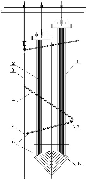本发明公开了一种水冷夹持型防晃动U形屏式过热器,其蒸汽进口段膜式管屏与蒸汽出口段膜式管屏的一端分别与U型弯头的一端相连构成U形屏式过热器;在U形屏式过热器的两侧各设置有一根与水冷膜式壁相连通的水冷夹持管,以防止其因受炉内高浓度循环灰的冲刷而引起晃动。两根水冷夹持管之间设置有限位板,保持水冷夹持管之间有足够的满足U形屏式过热器的膨胀空间,防止管屏晃动,同时使得U形屏式过热器受热后管屏仅能向下膨胀且无阻碍、不变形。U形屏式过热器的下部及水冷夹持管的迎风面设置有防磨罩;彻底解决了管屏膨胀受阻变形、L形屏穿墙处密封不严漏灰的问题,也解决了U形屏式过热器在炉膛内的晃动问题,大大减少了锅炉故障率。