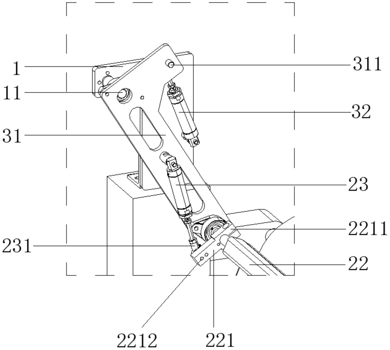 本实用新型公开了一种变位毛刷压纸机构,包括固定支架、排刷结构和摆动结构,所述固定支架上设有铰支轴,所述摆动结构包括摆臂和第一驱动件,所述摆臂的连接端与所述铰支轴可转动连接,所述摆臂的自由端与所述排刷结构活动连接,所述第一驱动件的输出端与所述摆臂传动连接且能够使所述摆臂绕所述铰支轴的轴线摆动。通过第一驱动件控制摆臂绕铰支轴的轴线实现翻动,从而带动排刷结构相对于进纸端口移动,实现调整排刷结构的压纸点位置的调整,并且能够调整毛刷的压纸角度,毛刷与纸板的内夹角越小作用于纸板表面的压力越小,进而可根据纸板的硬度调整压力,避免毛刷压伤纸板。
