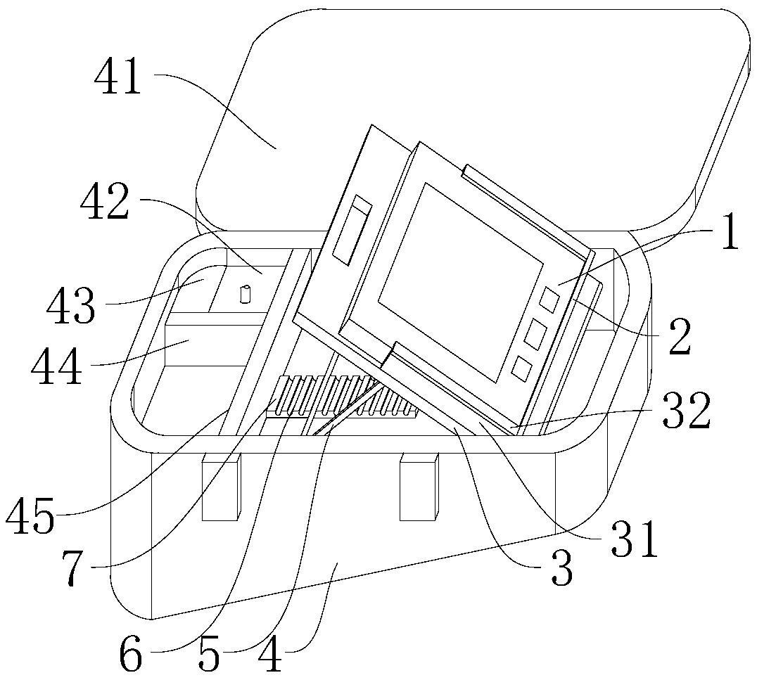本实用新型提供可量测动脉硬化的血压计,包括增加了检测动脉硬化算法的血压计本体以及放置盒,所述放置盒右侧内部通过转轴转动连接倾斜布置的活动平板,所述活动平板右侧朝外端固定连接底挡板,所述活动平板朝外端贴合设置血压计本体,所述活动平板左侧朝内端转动连接U型支撑架,所述放置盒内部底端固定连接阻挡板,所述阻挡板上端等距开设左右布置的若干个卡槽且卡槽内卡装U型支撑架的横向部,该设计将U型支撑架的横向部卡装到阻挡板上端合适位置的卡槽内,进而使活动平板呈一个合适倾斜角度,实现调整血压计本体的倾斜角度,满足人员进行使用,提升适用范围,也能对血压计本体进行折叠储存,安全性高。