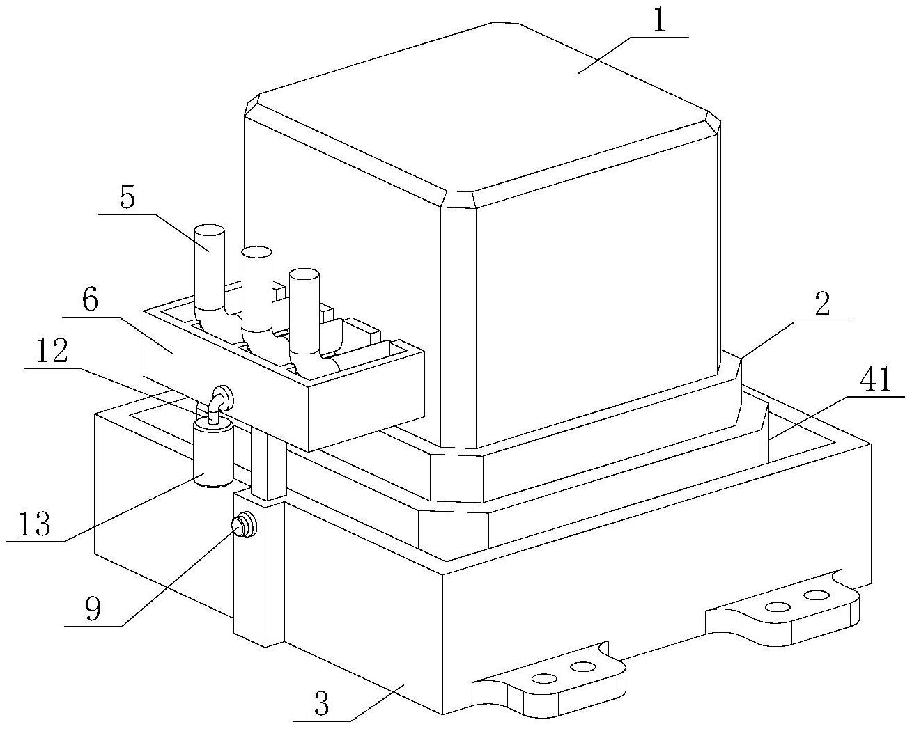 本实用新型公开了一种用于热泵热水设备的支撑结构,涉及热泵机组技术领域。本实用新型包括热泵机组本体和固定块,所述固定块顶部构造有固定槽且所述热泵机组本体嵌设在所述固定槽内,所述固定块底部设置有安装板,所述安装板与所述固定块之间设置有缓冲组件。本实用新型在使用时将热泵机组本体固定在固定槽内,在热泵机组工作的过程中,通过安装板与固定块之间的缓冲组件能够对热泵机组工作时产生的震动进行缓冲,以此能够避免长时间的震动对装置造成的影响和损伤,在使用时将承接板固定在管道的底部,在管道上出现冷凝水时,冷凝水能够通过引流板流动到承接板上,以此能够对管道上的冷凝水进行收集,避免冷凝水对其他物体造成污染。