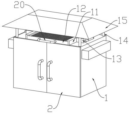 本实用新型涉及电力通信箱技术领域,具体为一种电力通信综合接入箱,包括主体,所述主体的表面活动连接有开关门,所述主体的内部固定连接有第一固定安装板,所述第一固定安装板的顶部固定连接有工作部件,本实用新型通过设有的固定散热孔、固定连接防护罩、第二固定安装板、第一固定限位块和散热风扇,便于通过散热风扇将主体内部的热空气向下吹动,使得空气能够在固定散热孔的内侧向外部进行流动,使得外部空气能够才能够主体的顶部向主体的内部流动,通过空气的流动能够带走主体内部的热量,并且能够通过固定连接防护罩对固定散热孔的出口进行防护,防止外部雨水进入固定散热孔和主体的内部。