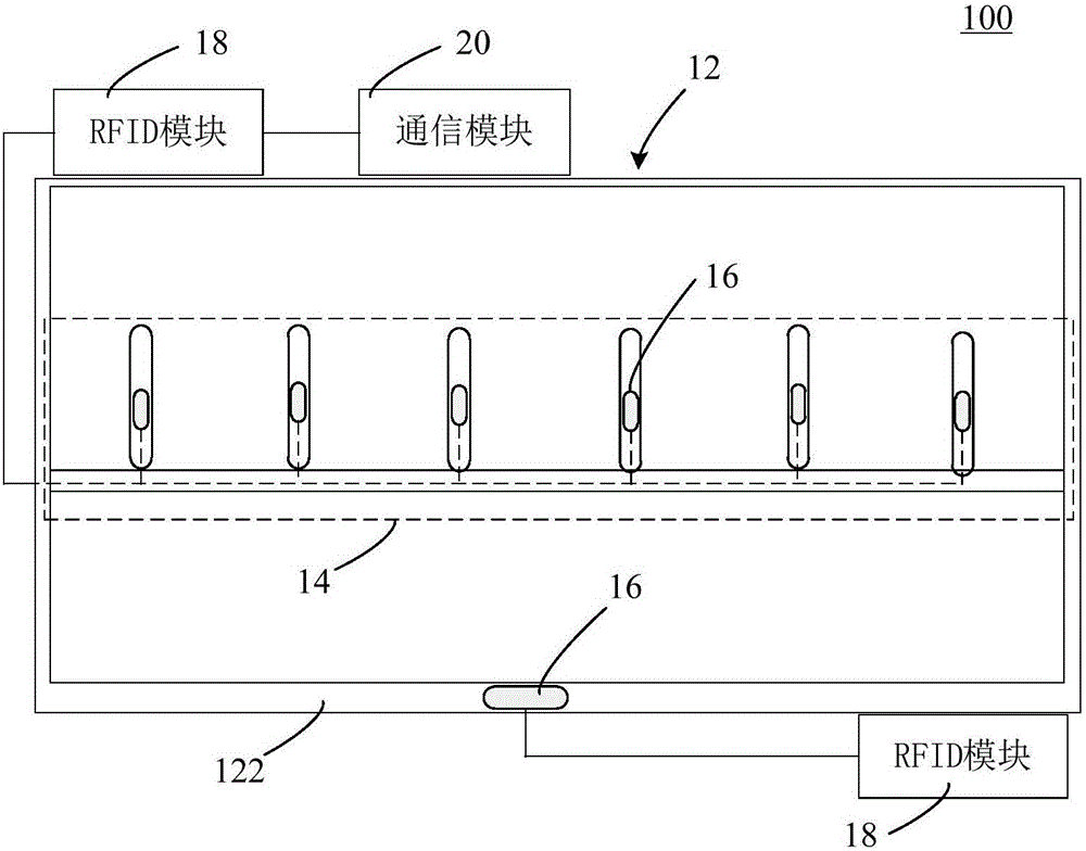 本申请涉及一种储物装置,包括柜体、储物栏、天线、RFID模块和通信模块。柜体用于放置携带相应RFID标签的各物品。柜体包括底板。储物栏位于柜体内,用于承载并分隔各物品。天线分别设置在储物栏和底板上,用于感应各物品相应RFID标签的射频信号。RFID模块位于柜体上并与各天线通信连接,用于接收各射频信号并识别得到各物品对应的物品信息。通信模块位于柜体上并与RFID模块通信连接,用于向目标设备发送物品信息。通过在储物装置内的分隔部和底板上合理的布设天线,以及通信模块的协同设计,大幅提高储物装置内物品信息的采集传输效率。