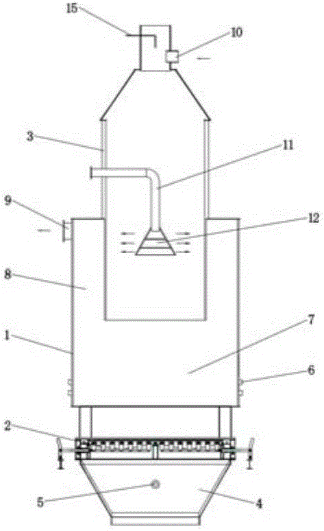 本实用新型公开了一种生物质高效气化反应炉,包括炉体和套设于炉体内的燃烧筒,所述燃烧筒中部架设风管,风管的出口端装配有形成向周边扩散喷吹风的布风罩。在三次风管出口端增设布风罩,风仅从布风罩周围喷出,增强了燃烧筒周边风量,充分利用壁体高温热辐射,使热辐射效果达到最大化,实现了中心和周边的均匀化燃烧。
