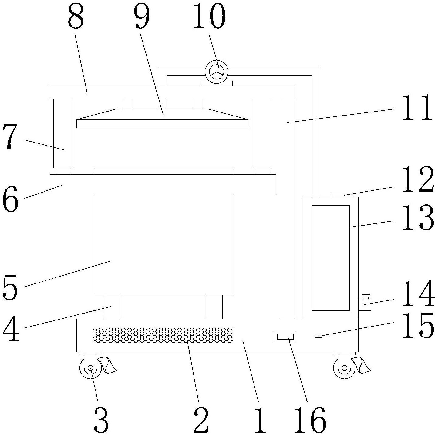 本实用新型公开了一种医用分子筛制氧机增效节能装置,包括底板,所述底板顶部左端的四周均固定连接有支撑杆,所述支撑杆的顶部固定连接有制氧机本体,所述底板顶部的右端固定连接有支撑板,所述支撑板的顶部固定连接有顶板,所述顶板的底部通过支架固定安装有吸盘,所述顶板底部的左右两端均固定连接有电动伸缩杆,电动伸缩杆的底部固定连接有回形板,回形板的内壁固定连接有毛刷。本实用新型通过通口、万向轮、回形板、电动伸缩杆、吸盘、风机、防尘网、集尘箱、电机、扇叶、通孔、排气口和毛刷相互配合,解决了现在的分子筛制氧机不具有除尘功能,导致分子筛制氧机的表面会积累大量灰尘,影响制氧机的工作效率的问题。